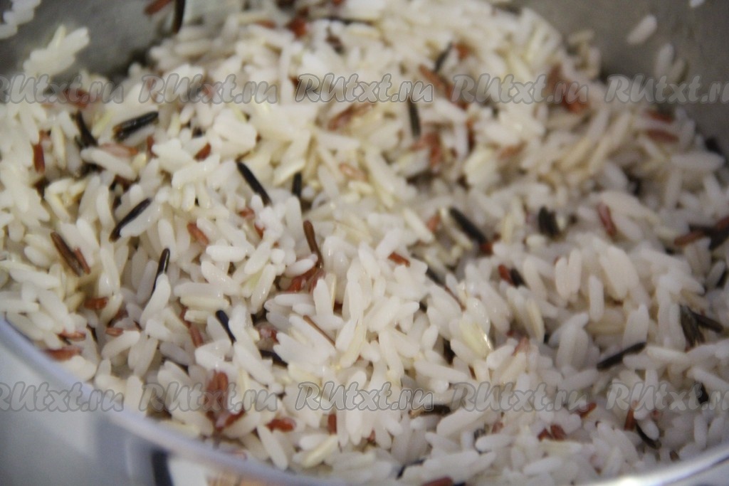 Рис сварить в соответствии с инструкцией на упаковке. Я варю рис до готовности в большом количестве подсоленной воды и пробую. Когда рис сварится, я откидываю его на сито и даю стечь воде. Вот такой рассыпчатый рис у меня получился.