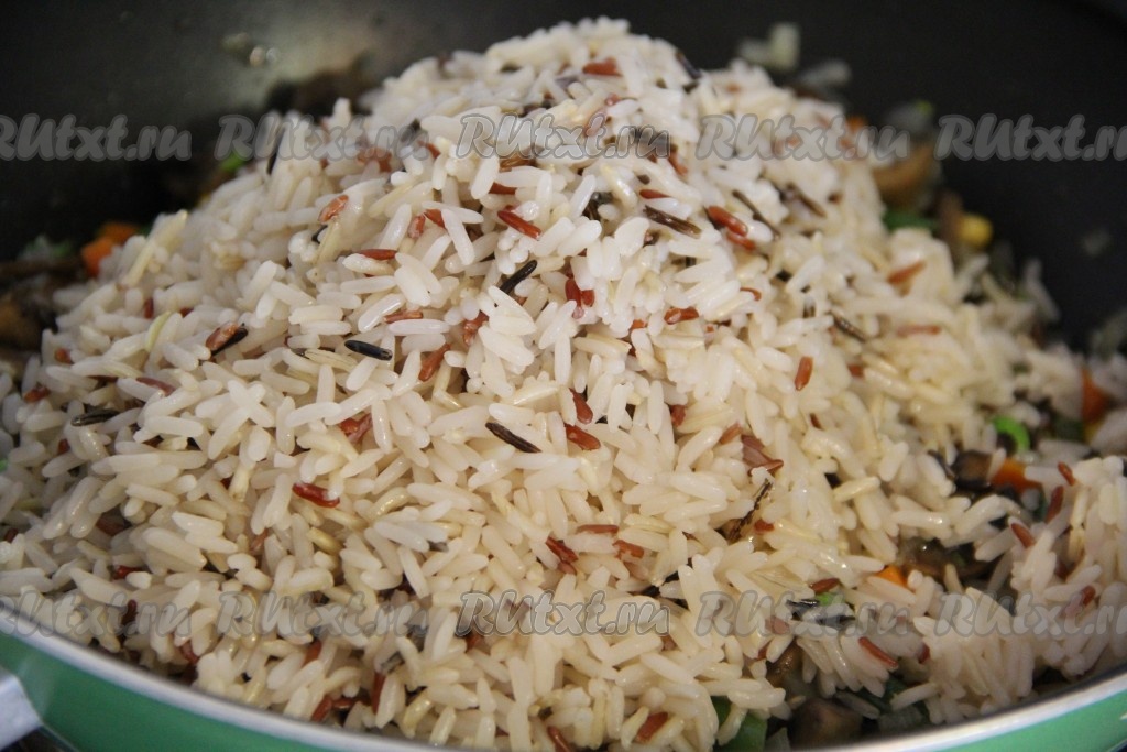Перемешать рис с овощами и грибами, подержать на огне в течение 5-7 минут, иногда перемешивая, затем накрыть крышкой и снять с огня. Дать гарниру настояться в течение 10 минут.