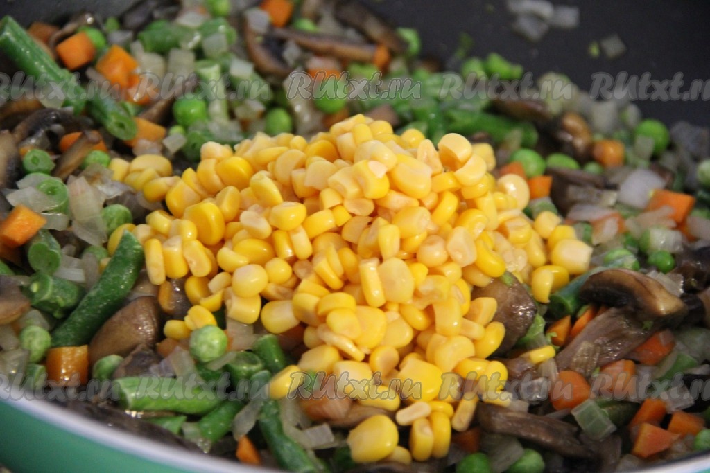 Как только овощи обмякнут, можно добавлять кукурузу. Всё хорошо перемешать и обжарить в течение нескольких минут, не забывая иногда перемешивать.