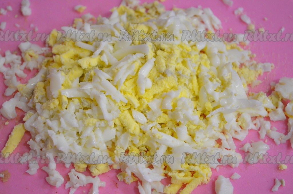 Далее разложить натертые яйца, посолить, нанести сеточку из майонеза.