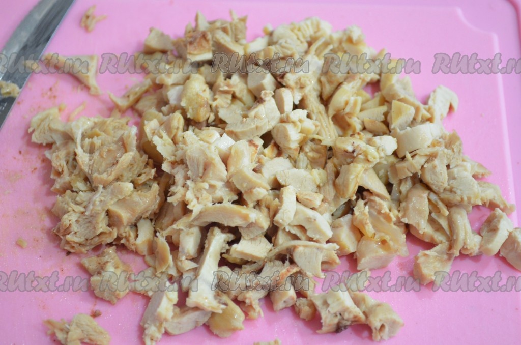 Первым слоем выложить куриное мясо, посыпать измельченным чесноком, солью, перцем, сделать сеточку майонеза.