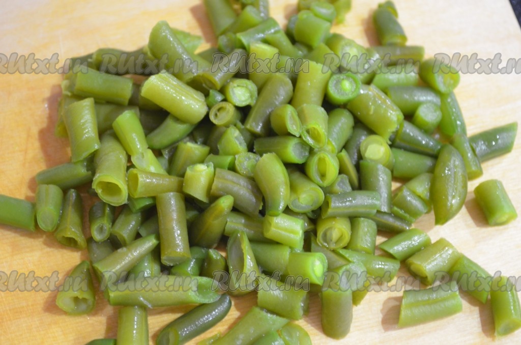 Стручковую фасоль залить водой и варить до готовности (5-8 минут с момента закипания), затем воду слить. Нарезать фасоль (по желанию можно нарезать помельче).