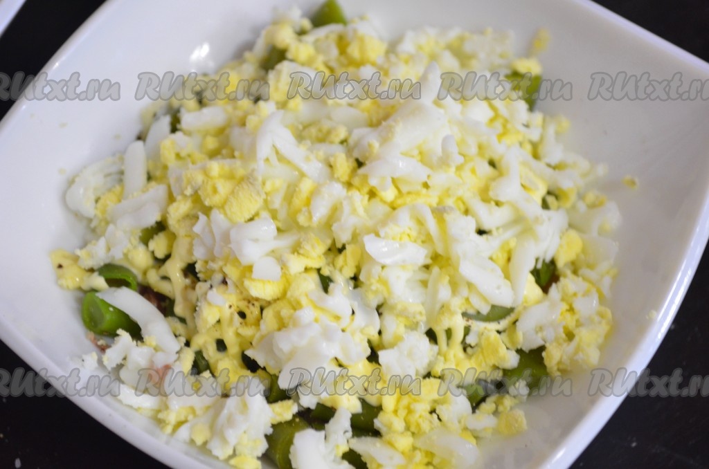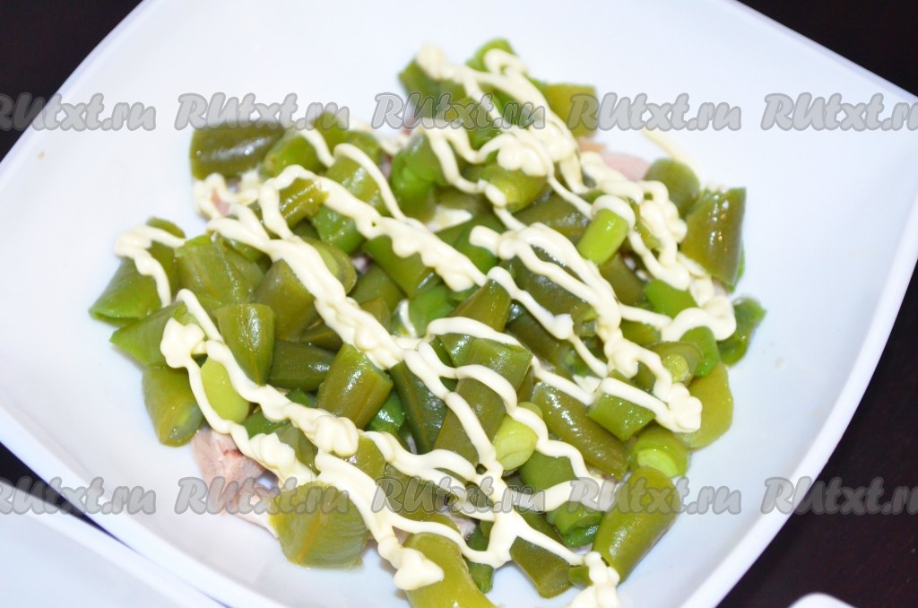 Дальше на курицу выложить слой стручковой фасоли, посолить и поперчить по вкусу, сделать на салате сеточку из майонеза.