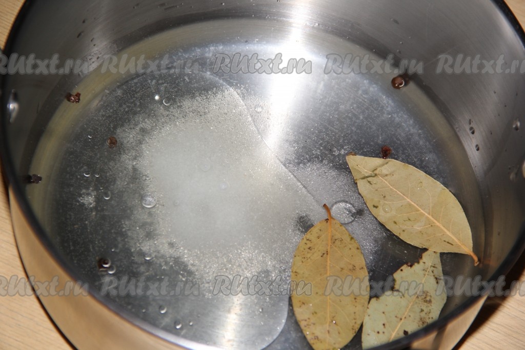 200 миллилитров воды влить в кастрюлю, добавить соль, сахар, горошины чёрного и душистого перцев, лавровые листья. Влить масло, уксус и сок, выдавленный из лимона. Поставить кастрюлю на сильный огонь, перемешать, довести маринад до кипения, проварить на небольшом огне 2-3 минуты, чтобы сахар и соль полностью растворились.