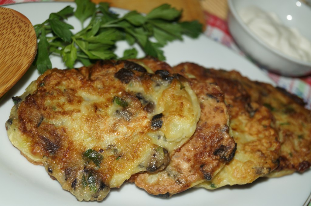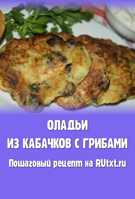 Аппетитные, вкусные, ароматные оладьи из кабачков с грибами подавать со сметаной.