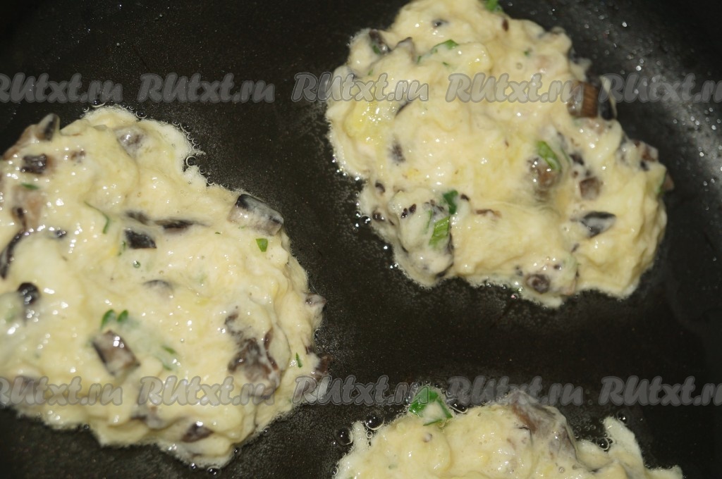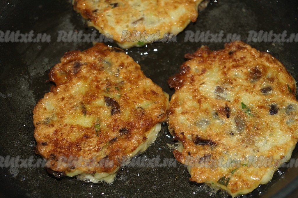 Жарить оладьи из кабачков с грибами на раскалённой сковороде на растительном масле, выкладывая столовой ложкой каждую оладушку.