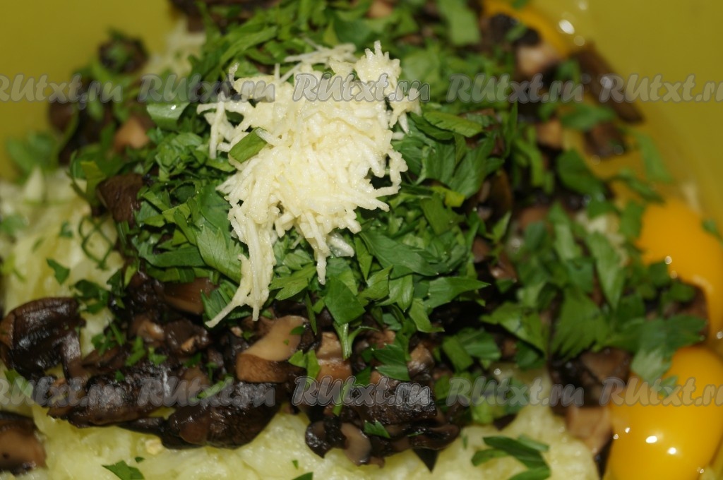 Чеснок очистить, натереть на мелкой тёрке. Зелень вымыть, мелко нарезать. Чеснок и зелень добавить к натёртым кабачкам, грибам и яйцам.