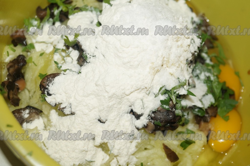 Затем к полученной массе добавить муку, соль и специи.