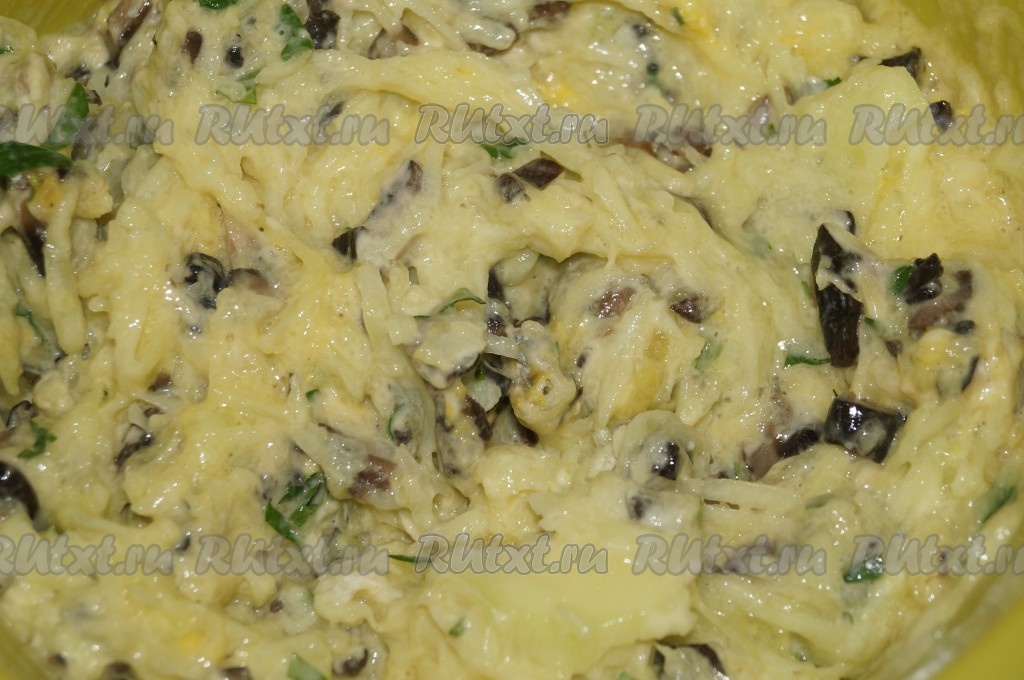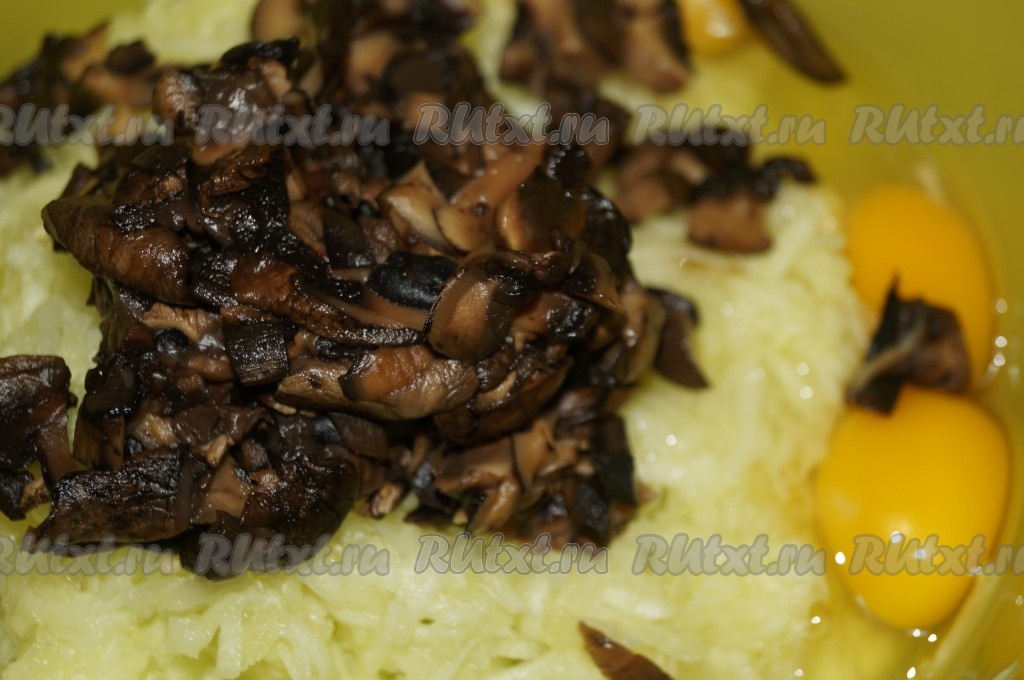 Лесные грибы очистить и отварить в подсоленной воде, периодически снимая пену, минут 30. Затем слить грибы в дуршлаг, слегка отжать руками от жидкости и мелко нарезать. Если готовите с шампиньонами, их отваривать не надо, достаточно будет их просто мелко нарезать. Добавить мелко нарезанные грибы к натёртым кабачкам и яйцам.