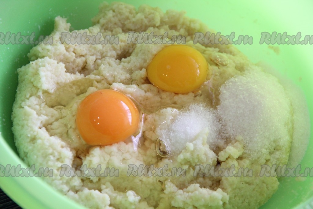 Затем влить тёплое молоко (температура молока должна быть 38-40 градусов) и опару.