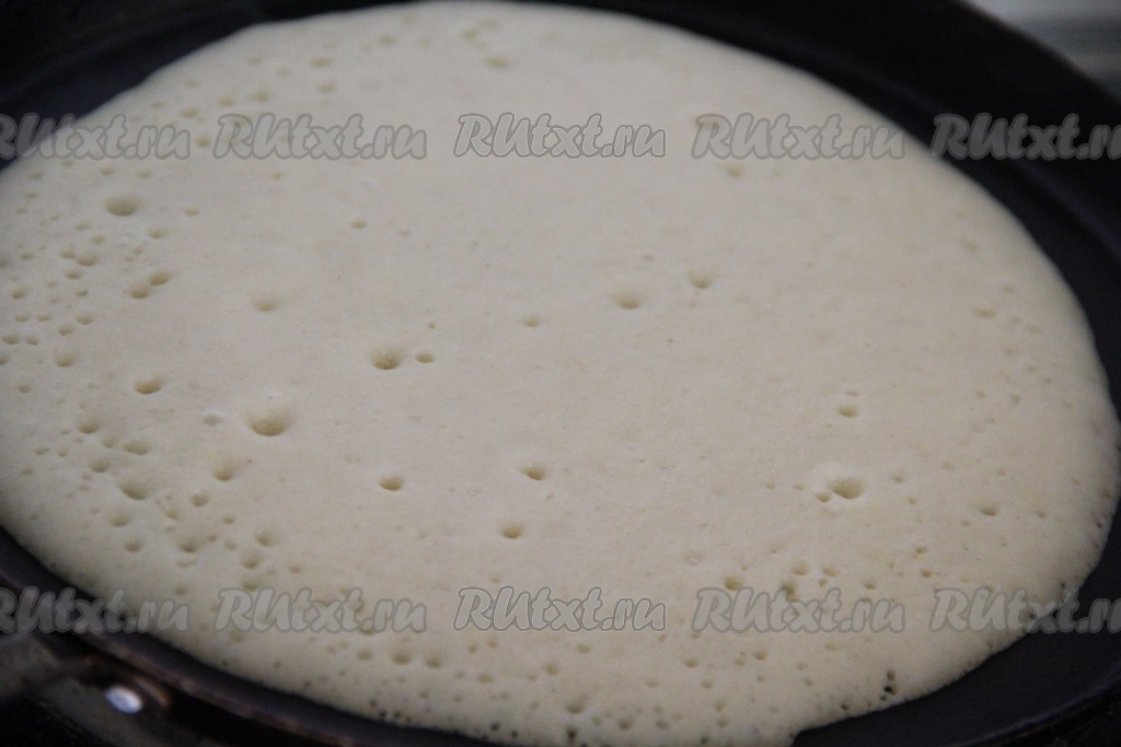 Сковороду хорошо разогреть, смазать маслом, вылить в сковороду небольшое количество теста и равномерно его распределить по сковороде.