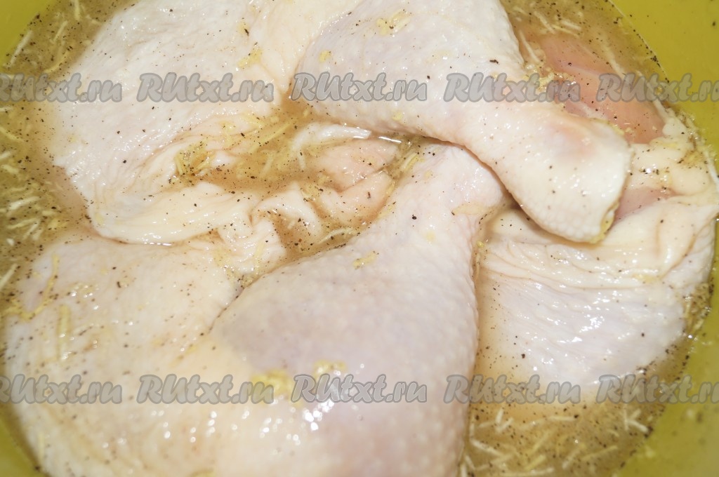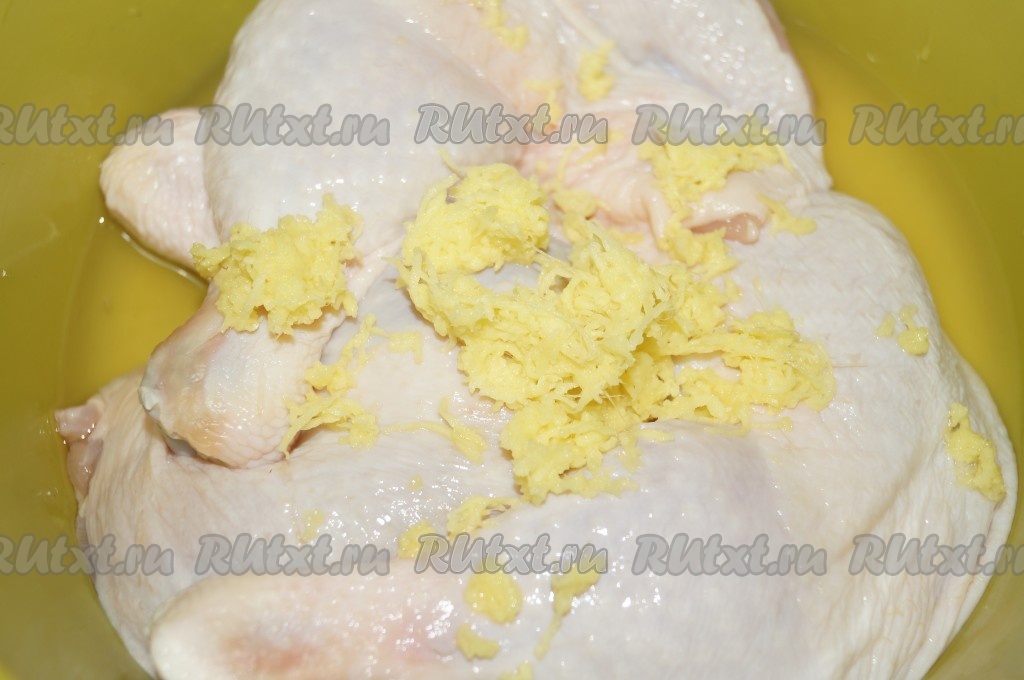 Порционные кусочки курицы хорошенько вымыть, обсушить бумажным полотенцем, выложить в миску. Добавить к куриному мясу чеснок, пропущенный через пресс (или очищенный имбирь, натёртый на мелкой тёрке).