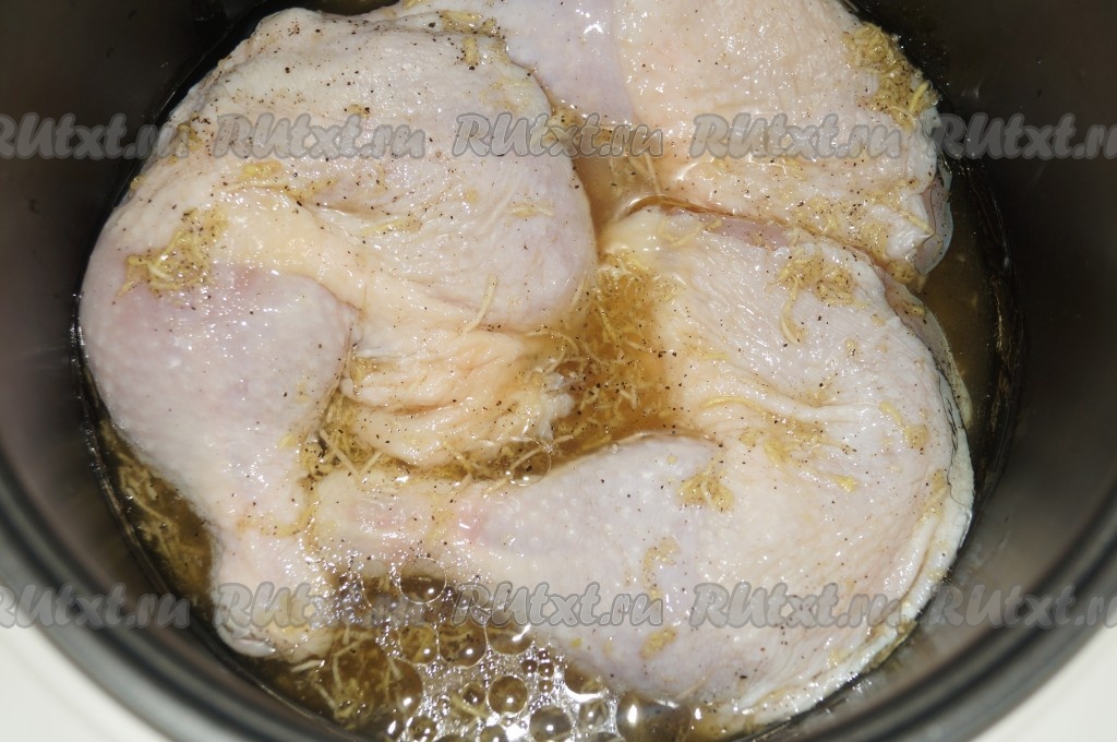 Затем в чашу мультиварки добавить растительное масло, выложить замаринованное мясо. Включить программу мультиварки "Жарка" или "Пароварка" минут на 20 и закрыть крышку мультиварки. Минут через 10 открыть крышку, перевернуть куриные кусочки на другую сторону и закрыть крышку. После звукового сигнала поставить программу "Подогрев" (у меня эта программа включается автоматически) и оставить ещё минут на 20.