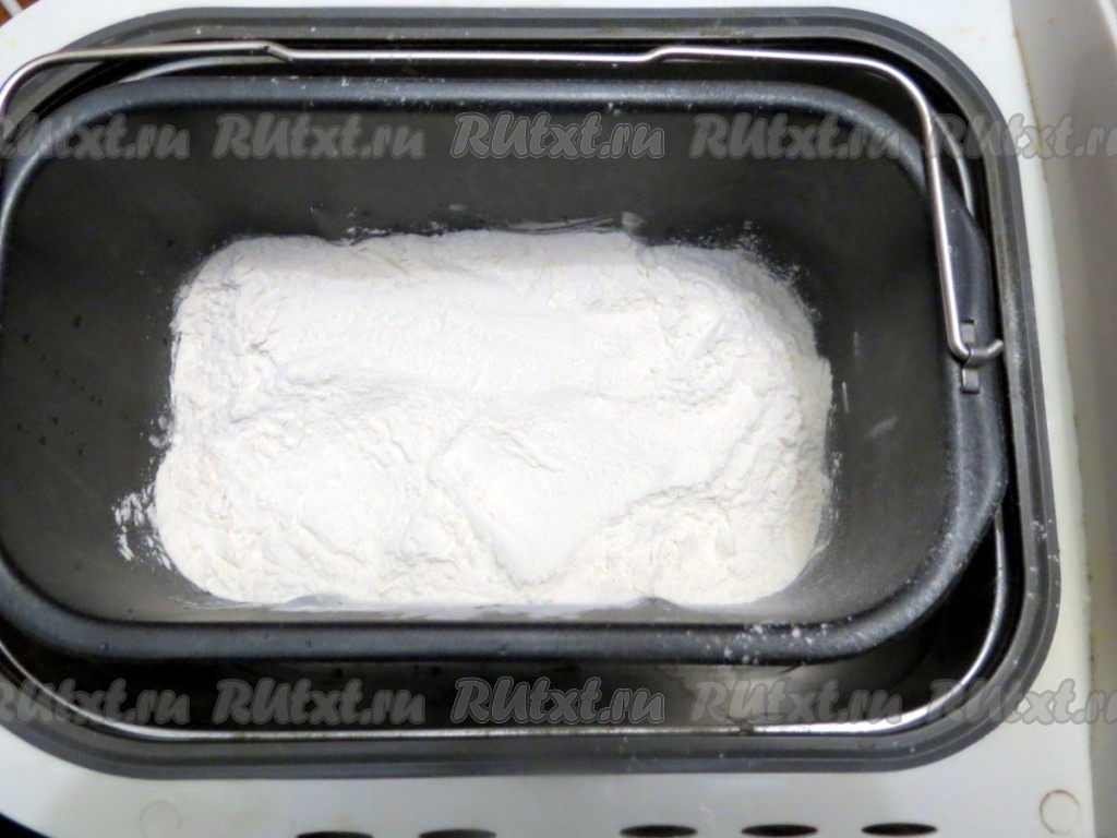 Муку просейте, добавьте к ней сухое молоко. Муку с молоком засыпайте так, чтобы она полностью покрыла жидкую часть. В разные углы положите соль и сахар.