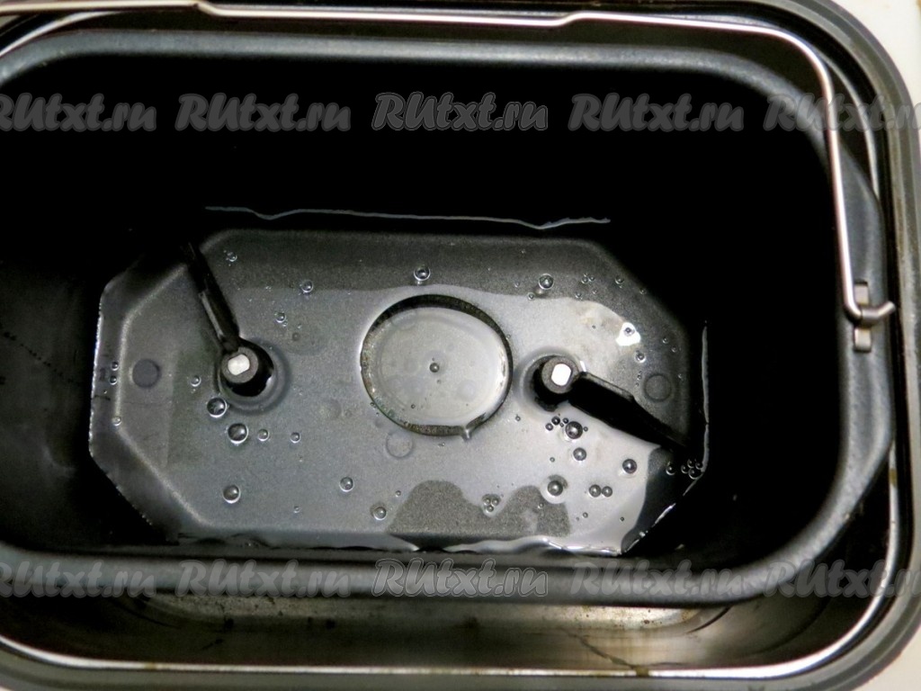 В ведёрко хлебопечки влейте воду и растительное масло.