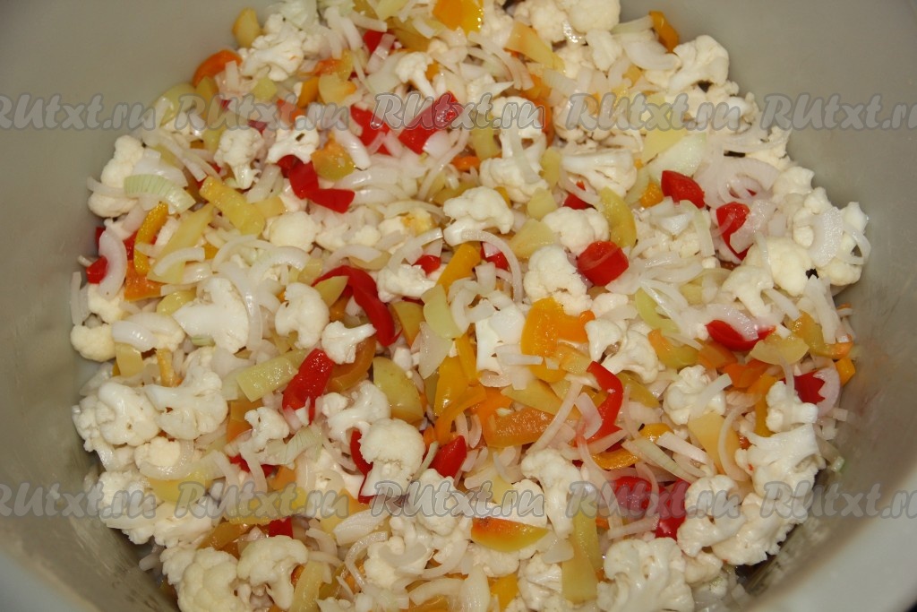 Овощи можно выложить послойно в баночки, я же перемешиваю все в кастрюле: лук, цветную капусту и перец.