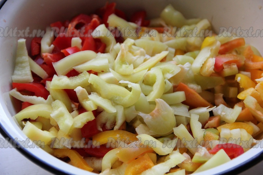 Сладкий перец нарезаем соломкой, также помещаем в кипящую воду и варим 4 минуты, вылавливаем и откладываем в сторону.