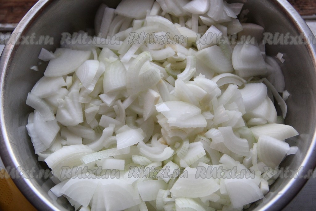 4 литра воды доводим до кипения и подсаливаем ее по вкусу. Лук нарезаем полукольцами и высыпаем прямо в кипящую воду, варим 2-3 минуты, достаем, воду сливаем с помощью дуршлага и откладываем лук в сторону.