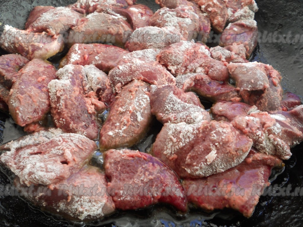 Посыпать печень 2 столовыми ложками муки, встряхнуть, чтобы все кусочки максимально покрылись мукой. Разогреть растительное масло в сковороде, выложить печень.