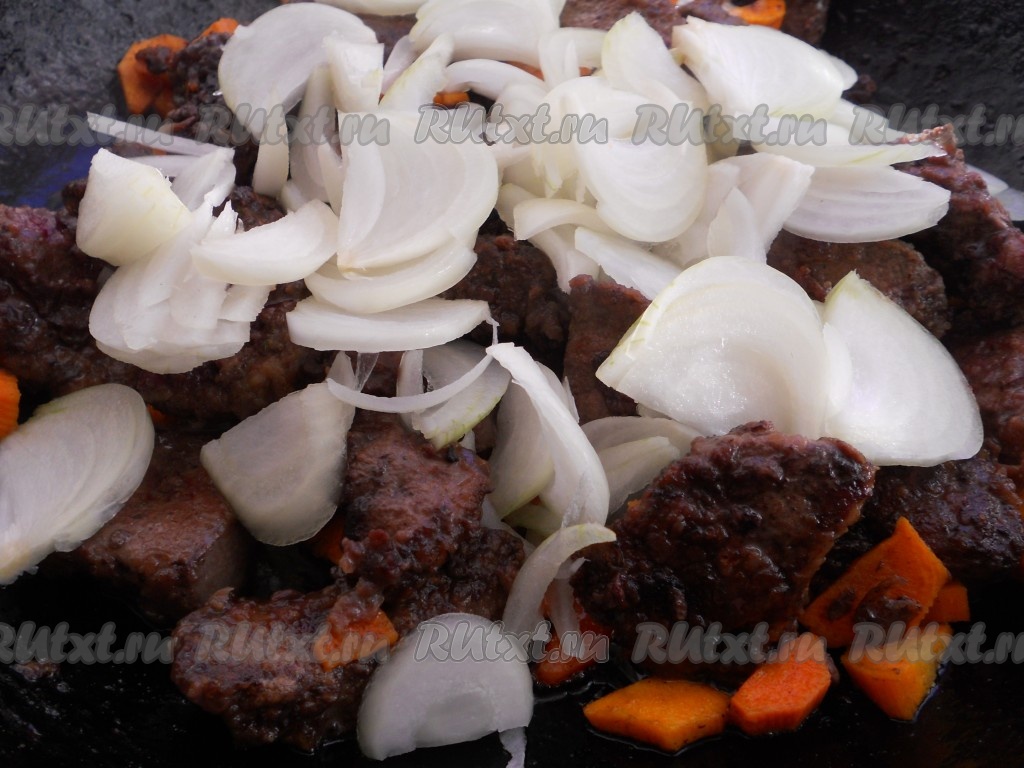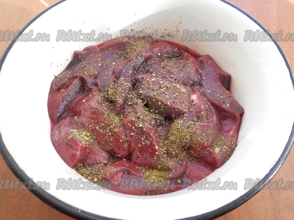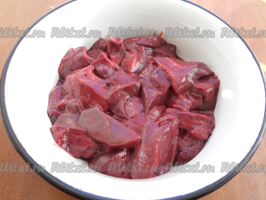 Говяжью печень нарезать средними кусочками, хорошенько промыть под проточной водой.