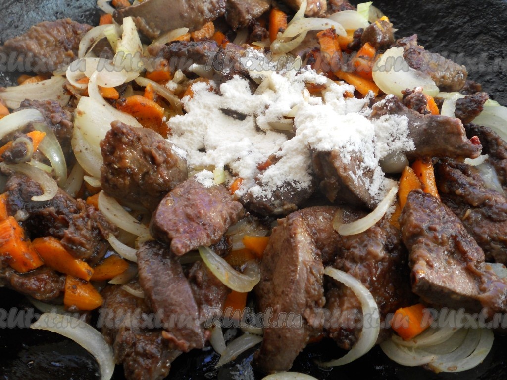 Всыпать в сковороду оставшуюся муку (1 столовую ложку) и хорошенько перемешать все. Сразу же влить бульон или воду.