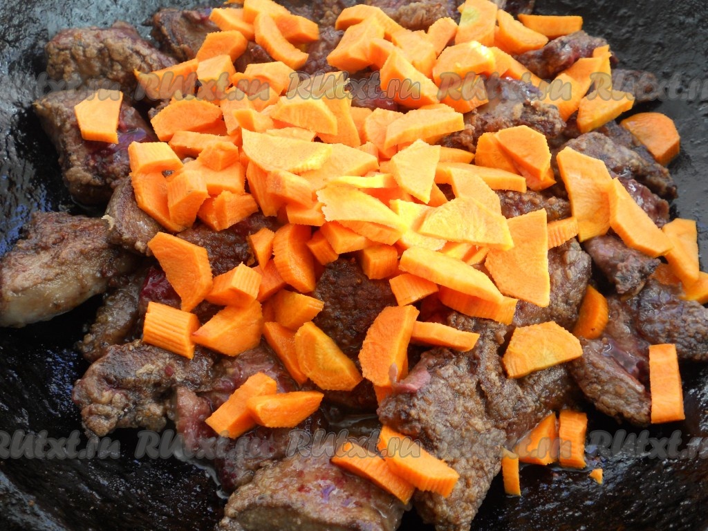 Обжарить говяжью печенку на среднем огне до румяности с каждой стороны (около 7-10 минут). Добавить нарезанную небольшими кусочками морковь. Перемешать и обжаривать, помешивая, вместе с печенью минуты 4 на небольшом огне.