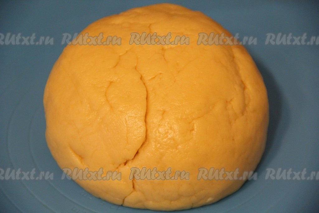 Замесить тесто (лучше это делать руками). Если тесто липнет к рукам, подсыпьте немного муки. Тесто должно получиться мягким, нежным и очень податливым. Завернуть его в пищевую плёнку и убрать в холодильник на 30 минут.