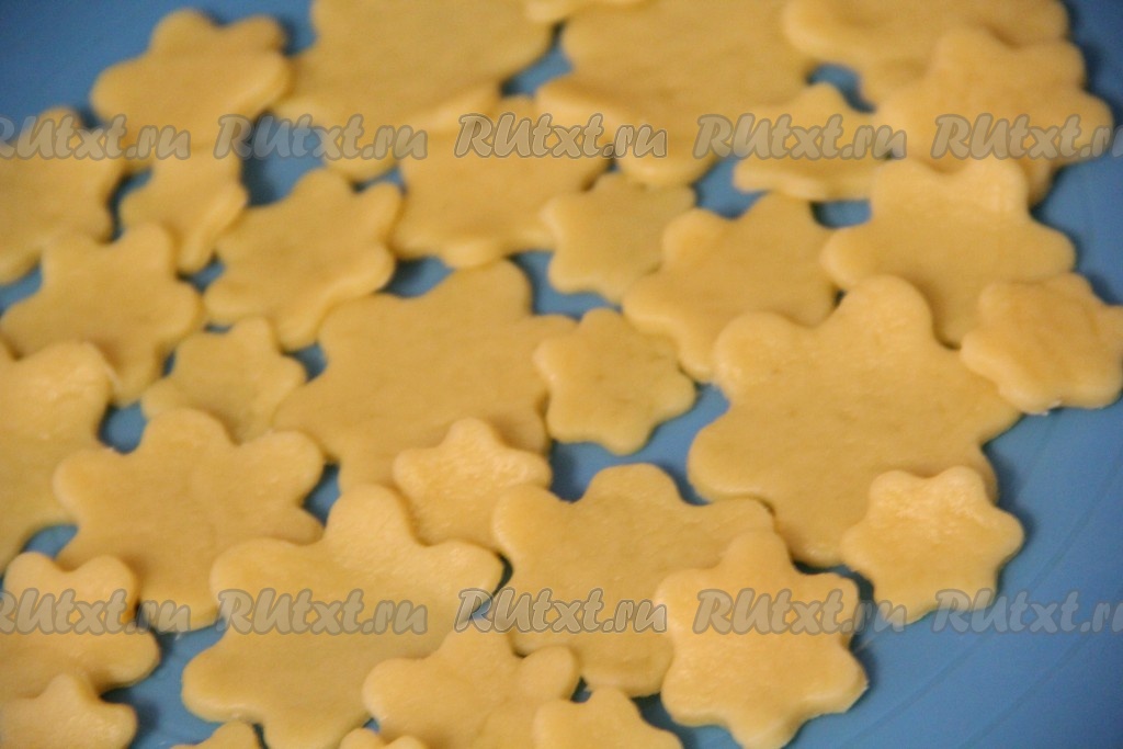 Вторую часть теста раскатать скалкой, вырезать цветочки с помощью формочек для печенья.