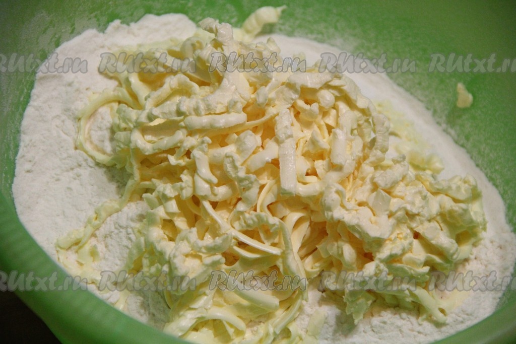 Муку просеять в глубокую миску, добавить разрыхлитель. Масло порубить на мелкие кусочки или натереть на крупной тёрке, добавить в муку и растереть в крошку. Это можно сделать руками или с помощью вилки.