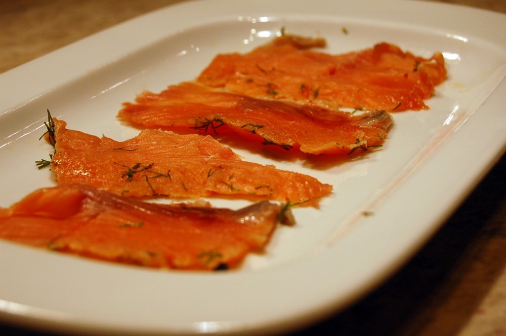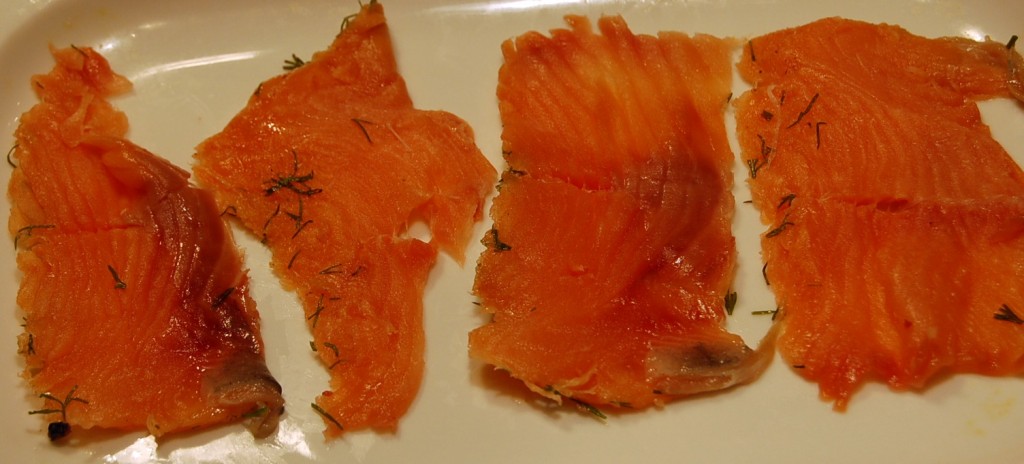 Нарезать очень вкусную красную рыбу тонкими ломтиками.