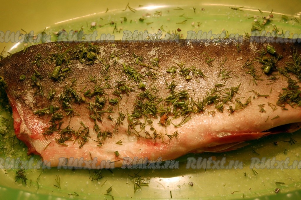 Начинаем засолку горбуши. Приготовить контейнер и в него выложить филе рыбы. Приготовить смесь из соли, сахарной пудры, перца и мелко нарезанного укропа. Большей частью смеси посыпать нашу горбушу.