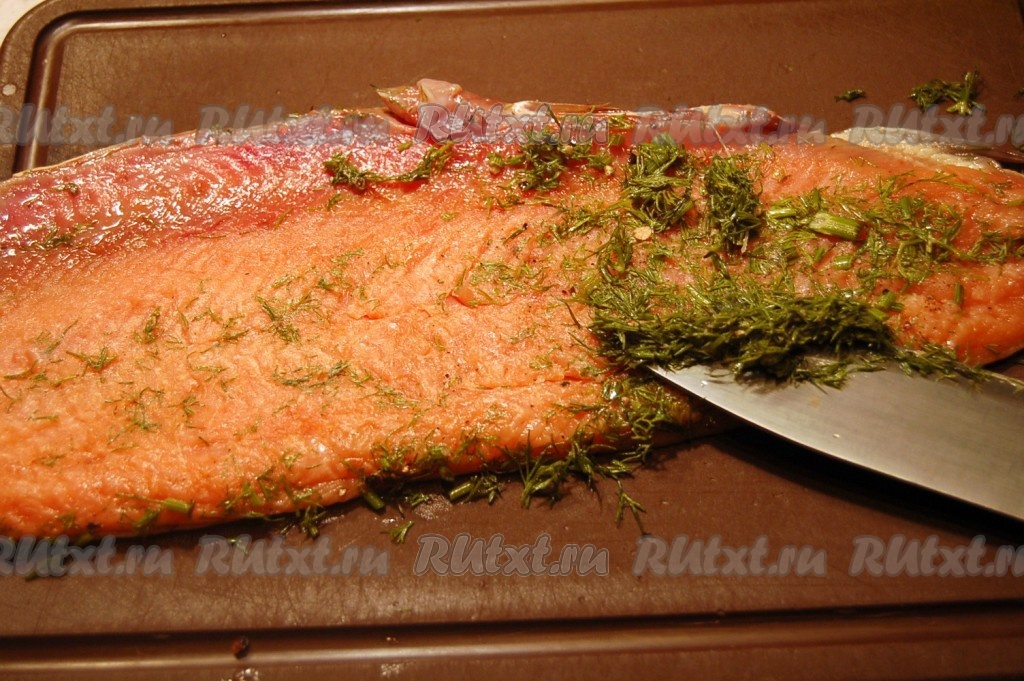 Накрыть вторым филе и сверху разбросать остатки соли с перцем, сахаром и укропом.