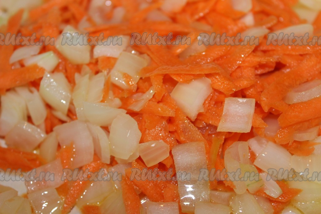 В сковороде разогреть растительное масло, выложить нарезанный лук и обжарить его на среднем огне, периодически помешивая, в течение 3-5 минут. Затем добавить натёртую морковь, жарить 3-5 минут, иногда помешивая.
