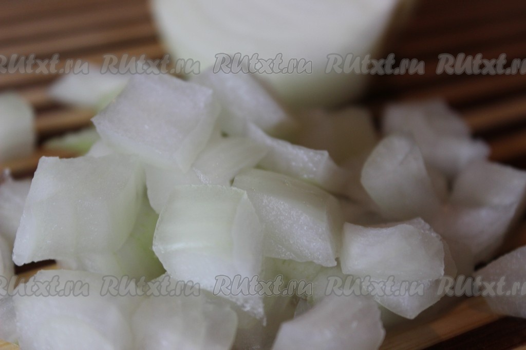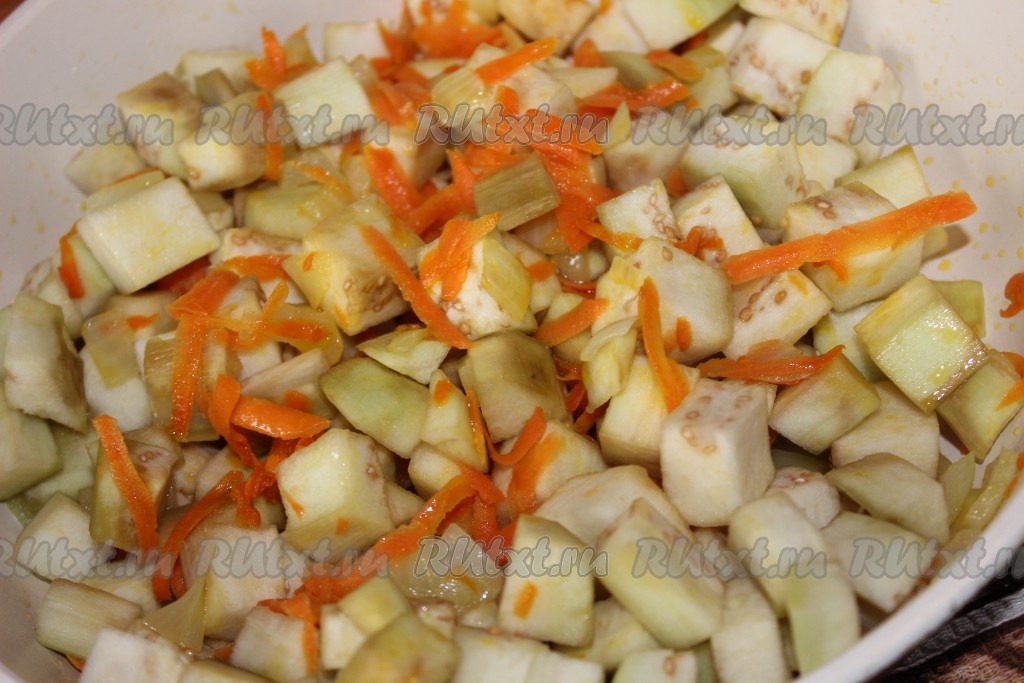 Баклажаны тщательно вымыть, очистить от кожуры, нарезать на небольшие кубики. Для удаления горечи посыпать баклажаны солью и оставить на 10-15 минут. Затем промыть под проточной водой и просушить на бумажном полотенце.