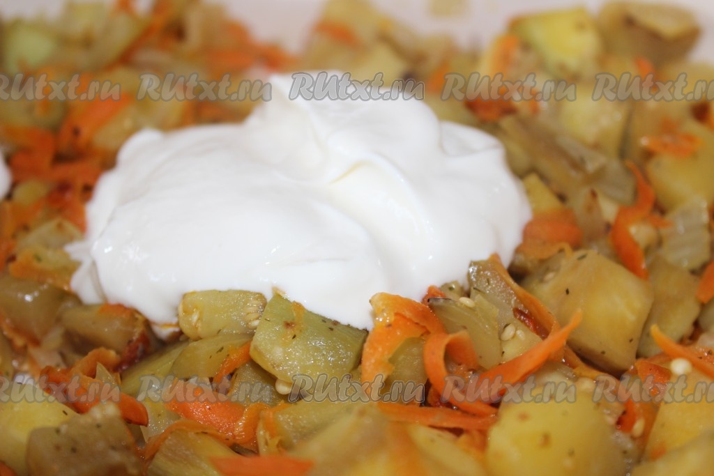 Затем в сковороду с овощами добавить сметану, грибную приправу, пропущенный через пресс чеснок, посолить, поперчить по вкусу, перемешать. Потушить 5 минут, постоянно помешивая.