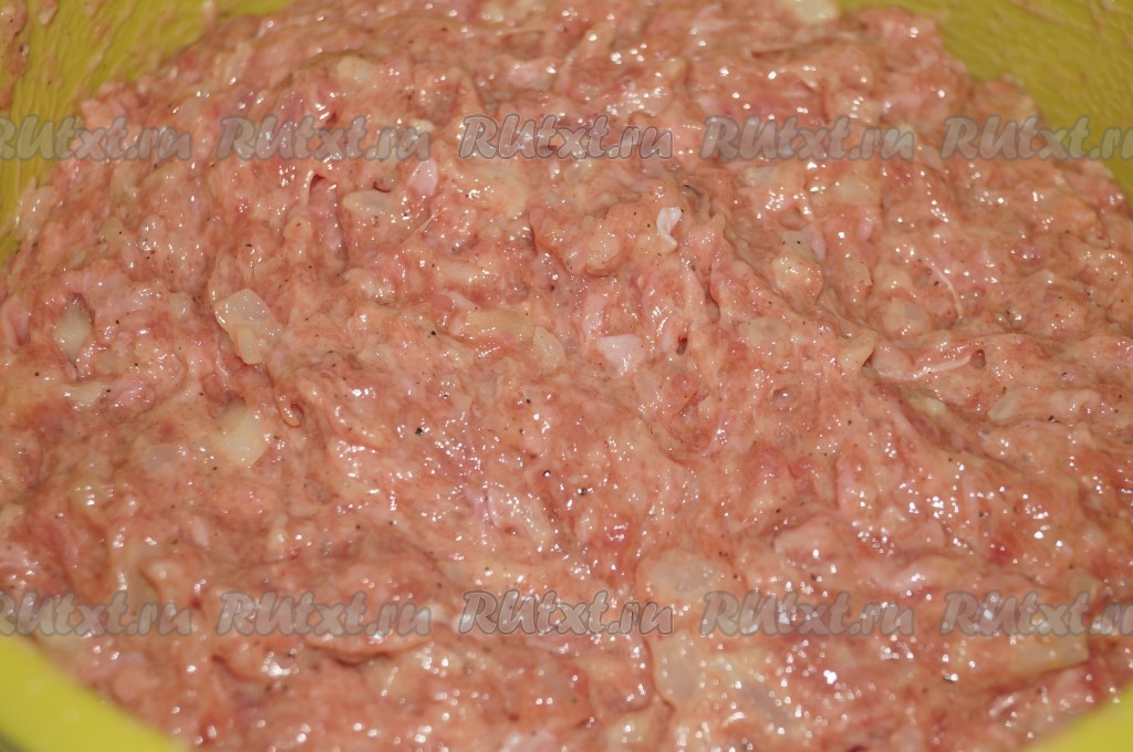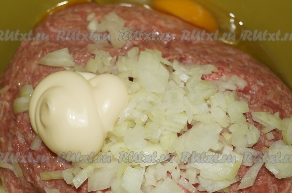 Для приготовления фарша кусочек мяса пропустить через мясорубку. Репчатый лук очистить, мелко нарезать и добавить к фаршу вместе с яйцом и майонезом.