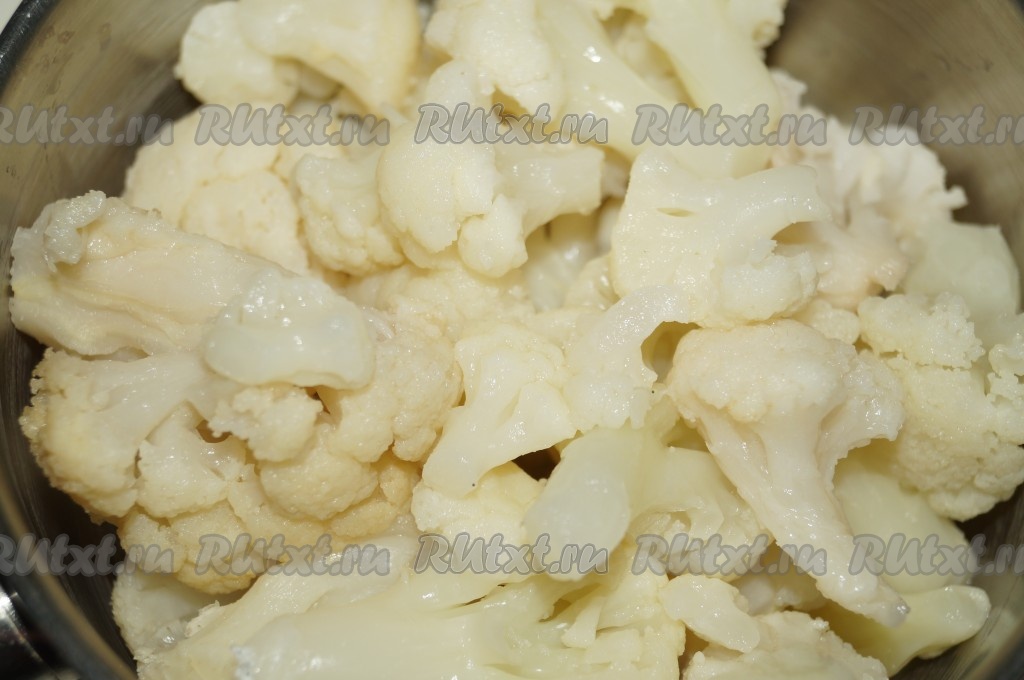 Цветную капусту, разобранную на соцветия, залить водой, поставить на огонь, довести до кипения, посолить и варить минут 7-10 с момента закипания. Готовую капусту откинуть на дуршлаг, чтобы убрать лишнюю воду, остудить и мелко нарезать.