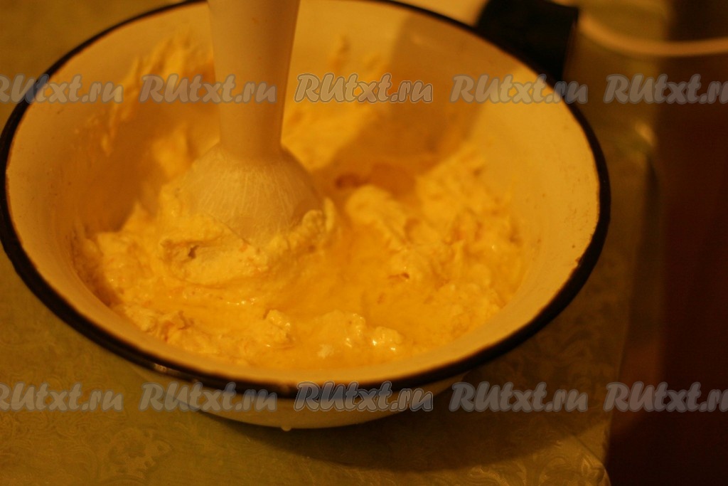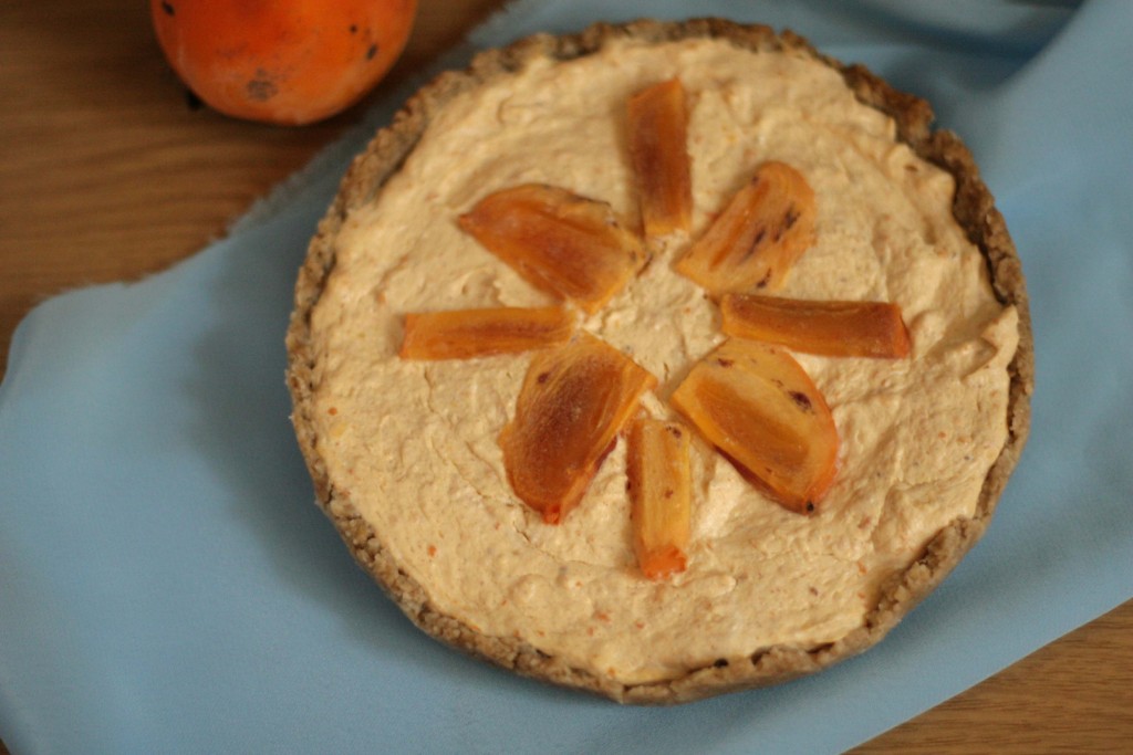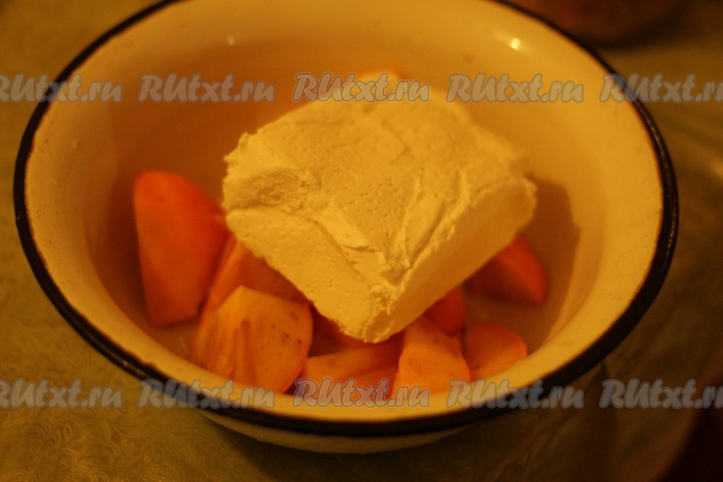 Духовку разогреть до 180 градусов. Поставить основу пирога из овсяной муки выпекаться на 10 минут. Тем временем, для начинки хурму нарезать небольшими кусочками и измельчить её блендером вместе с творогом.