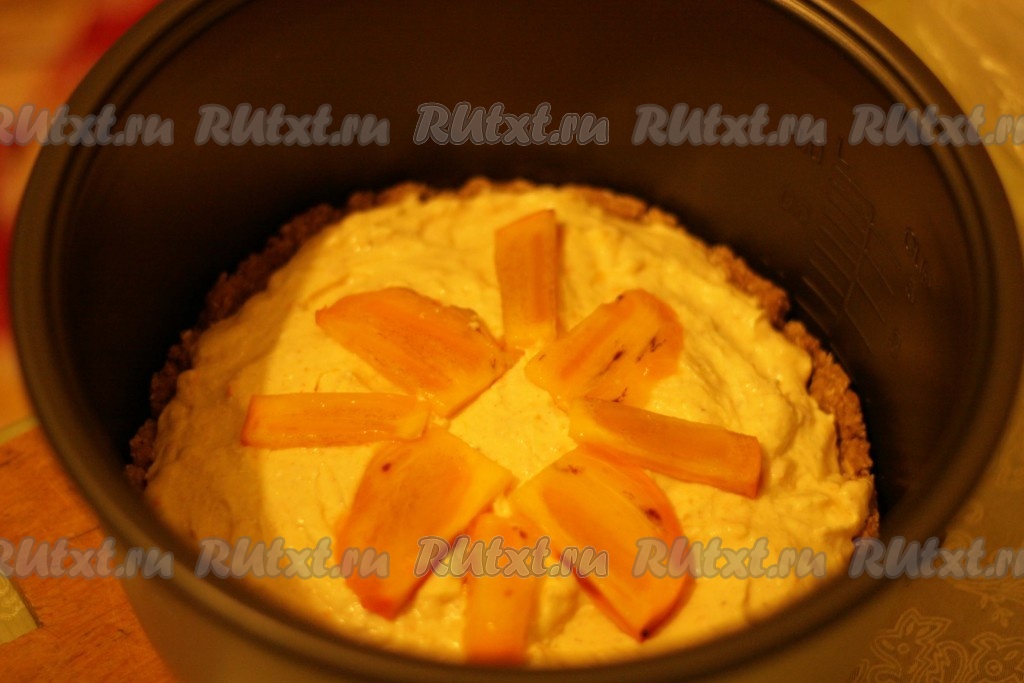 Выложить творожную начинку на испеченную основу пирога. По желанию пирог можно украсить кусочками хурмы.