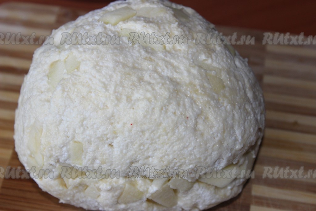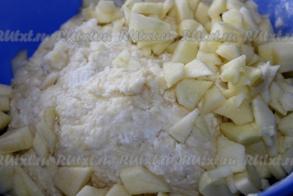 Замесить тесто сначала вилкой, затем руками. По желанию можно добавить в тесто очищенное от семян и кожицы, нарезанное маленькими кубиками яблоко и аккуратно перемешать.