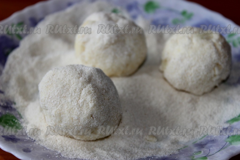 Сформировать из теста шарики величиной с грецкий орех. Чтобы шарики легко формировались, руки необходимо смачивать водой. Обвалять шарики в манке.