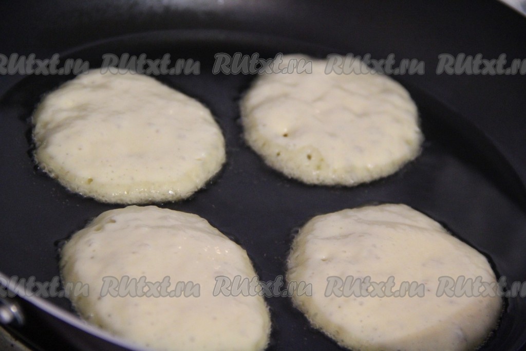 Тесто для дрожжевых оладий на кефире слегка поднимется и начнёт пузыриться. Перед выпеканием оладий не нужно перемешивать тесто.