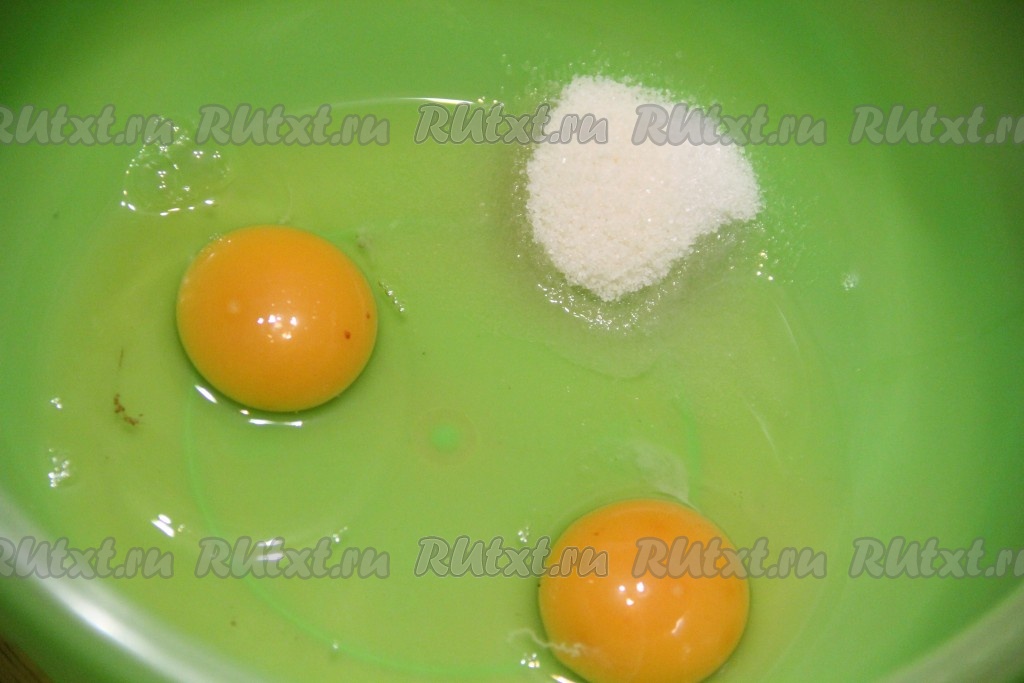 В глубокую миску вбить яйца, добавить сахар и ванильный сахар.