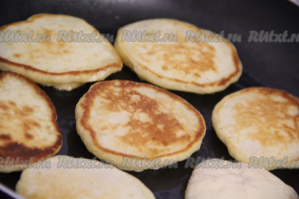 Выпекать оладушки на среднем огне с двух сторон до золотистого цвета. Затем переложить на тарелку. Не перемешивая дрожжевое тесто, постепенно пожарить все оладьи.