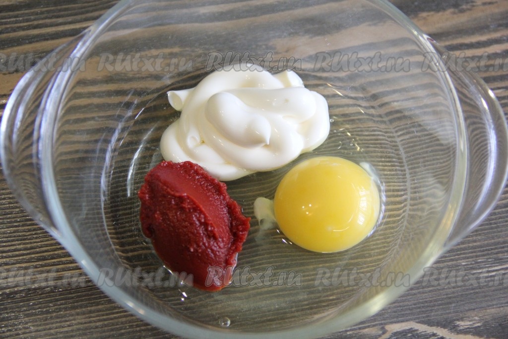 В миске соединить томатную пасту, яйцо и майонез. Всё слегка перемешать.