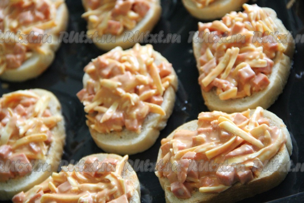 Выложить на поверхность хлеба колбасно-сырную массу и слегка разровнять.