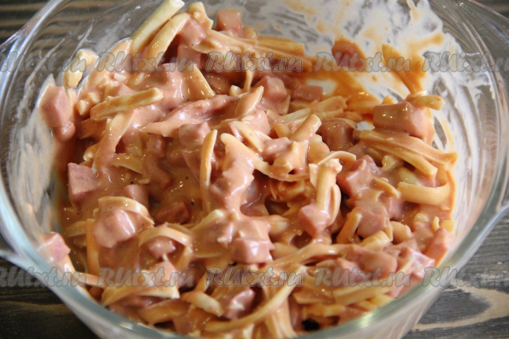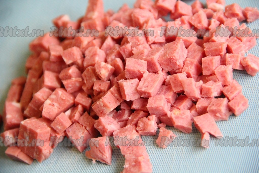 Колбасу нарезать мелкими кубиками.