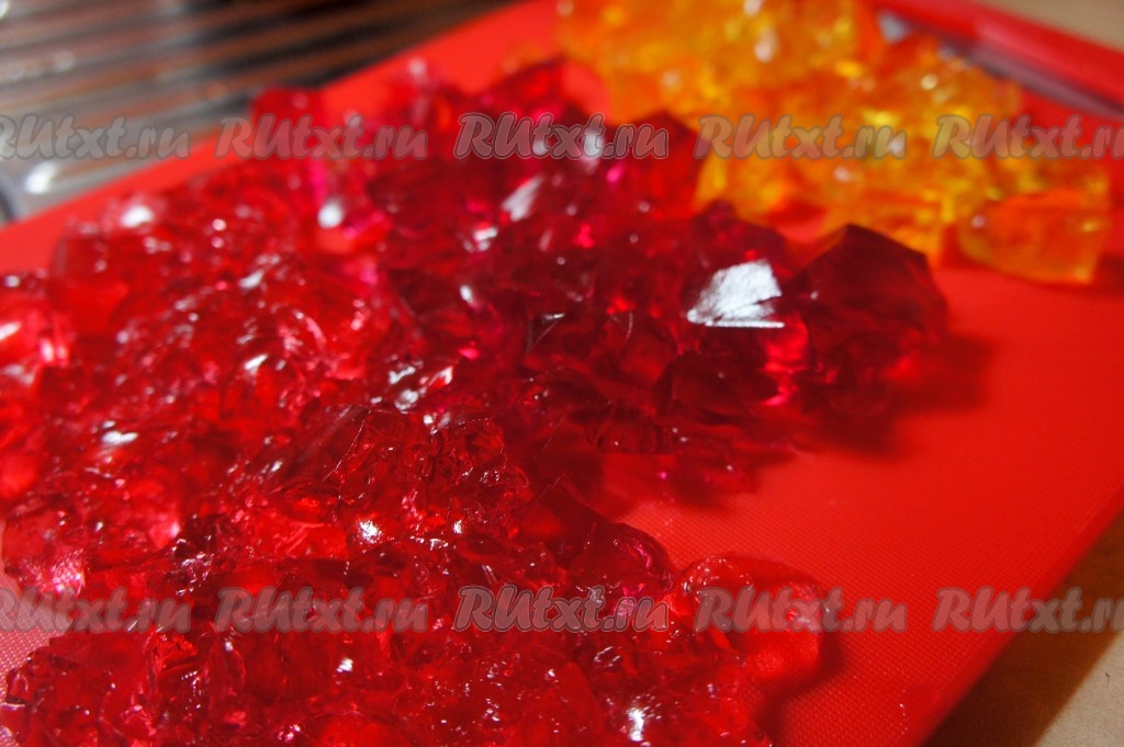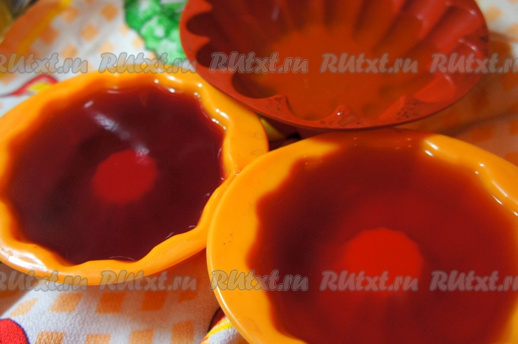 Желе приготовить согласно инструкции на упаковке, но добавить чуть меньше воды, чем указано, чтобы оно было более плотным.