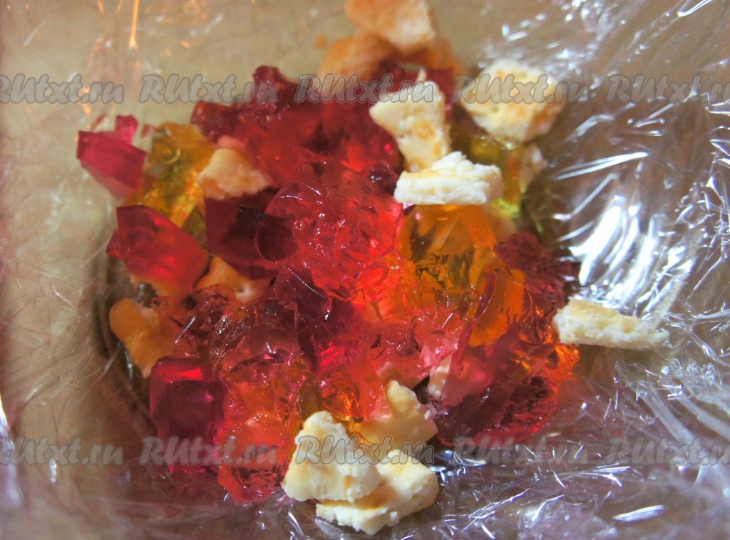Глубокое блюдо застелить пищевой плёнкой, выкладывать наш торт "Битое стекло" слоями: печенье, желе.