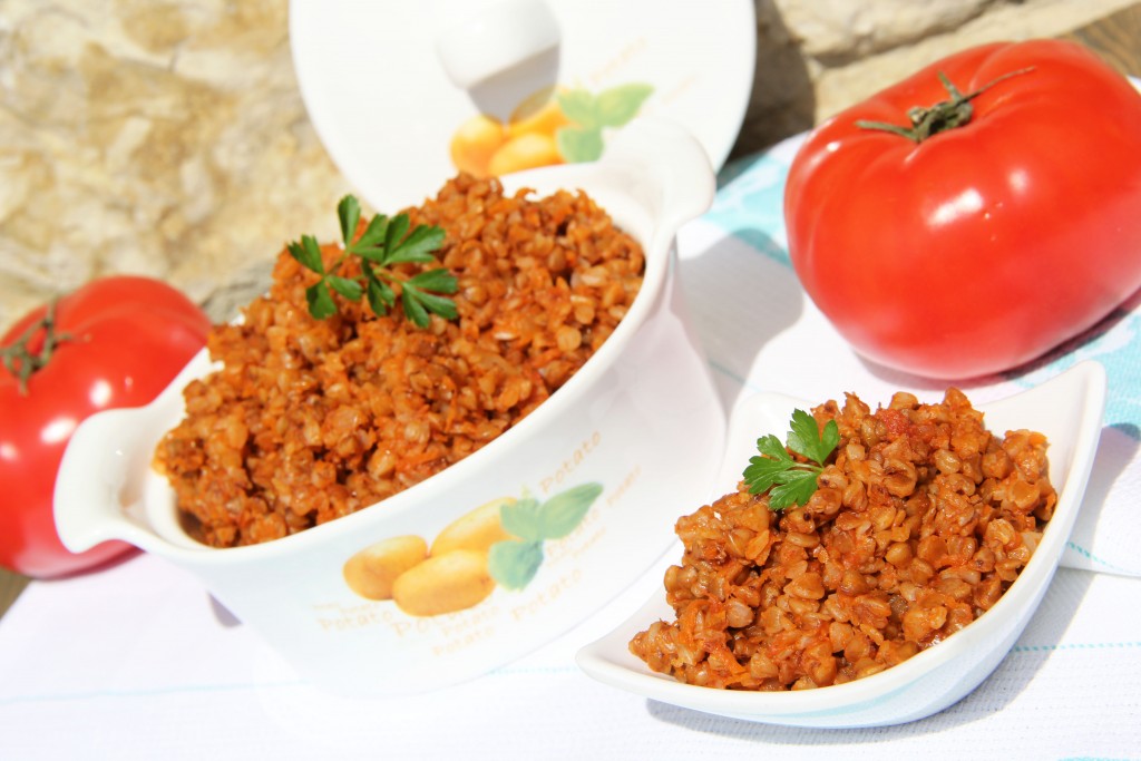 Хочу предложить Вашему вниманию рецепт приготовления гречки с помидорами. Подать это блюдо можно и в качестве основного, и в качестве гарнира к жареным котлетам, сосискам или сарделькам. Гречка с помидорами получается очень вкусной, рассыпчатой и ароматной. Попробуйте, и вам обязательно понравится это прекрасное блюдо.